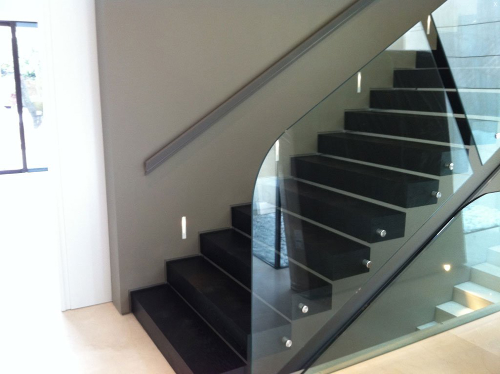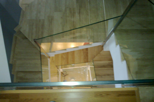 Vidrio laminar 4 + 4 transparente. Encastrado a escalera construcción de hierro. Instalada continua.