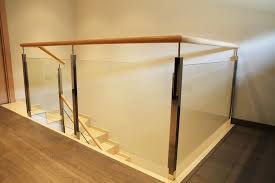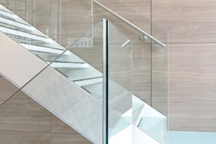 Vidrio laminar 4 + 4 transparente. Encastrado a "U" de acero inoxidable y a pasamanos acero inoxidable.