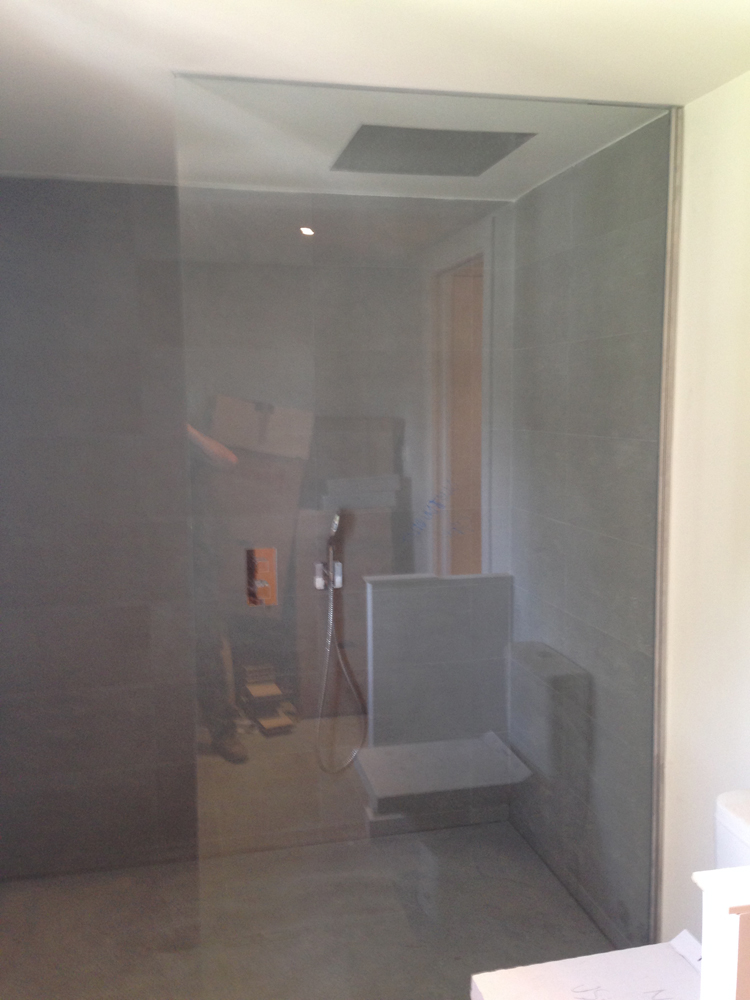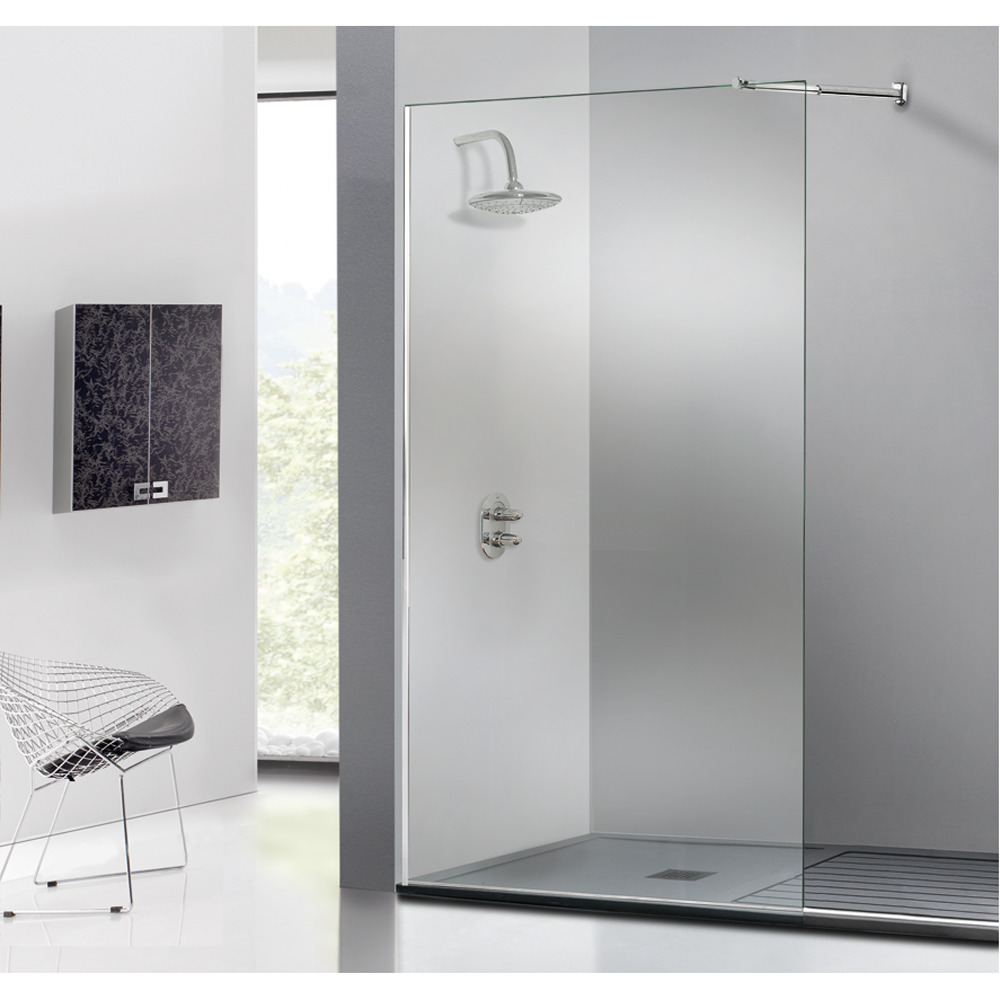 Anclado a suelo y techo con pinzas de sujeción de acero inox. y franja mateada a media altura.